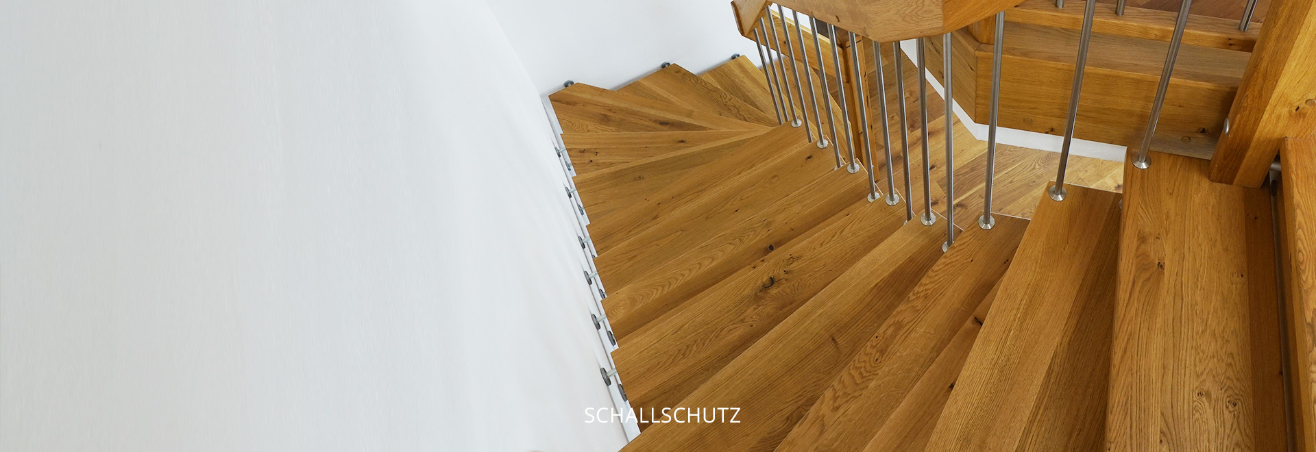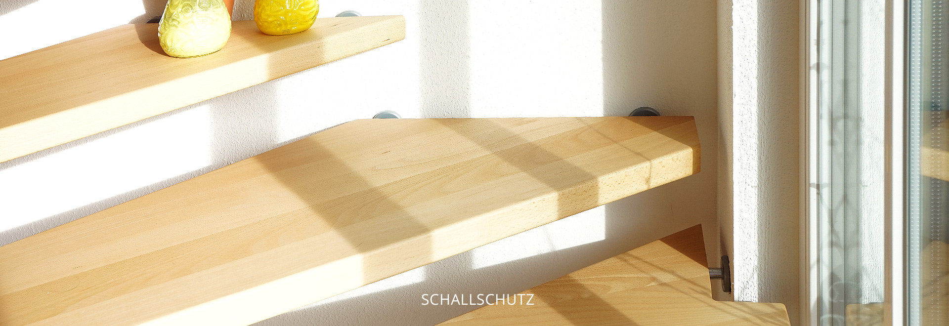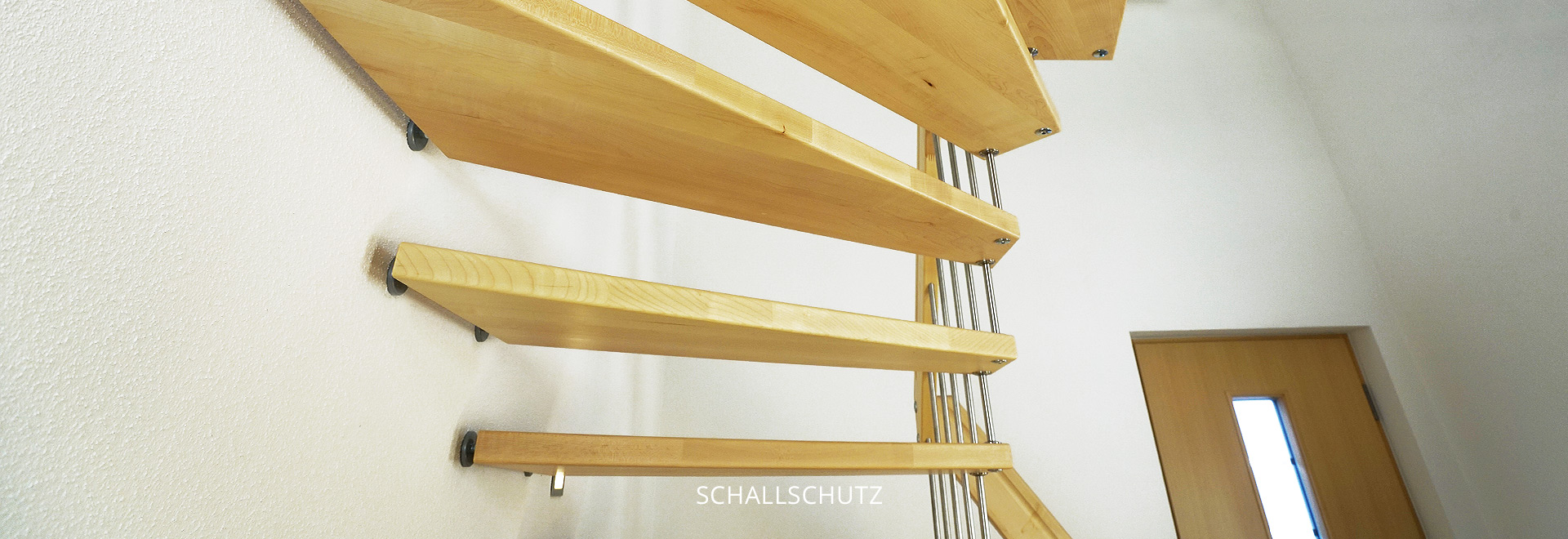 Die Wandlager sind aus microporigem Elastomer, die Stahlbolzen schalldämmend in der Wand verankert, die Freiseite geländertragend, oder zwischen zwei Wänden beidseitig wandgelagert und alle Anschlüsse schallentkoppelt. Die Treppe lässt sich in Hartholz (Buche, Esche, Eiche, Birke, Ahorn, Schwarznuss oder Kirsche) fertigen; lackieren oder mit Bio-Hartwachsöl fertig versiegeln, Wangenholz wie Treppenstufen mit rechteckigem Vollholzhandlauf, senkrechten Edelstahlstäben und schwebendem Untergurt ausstatten.