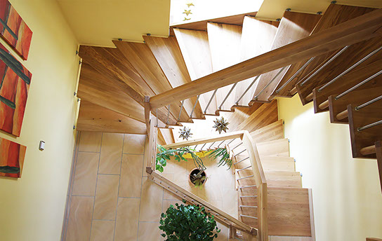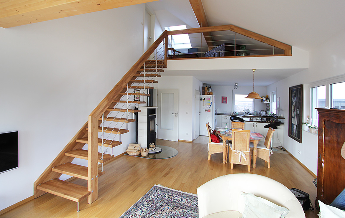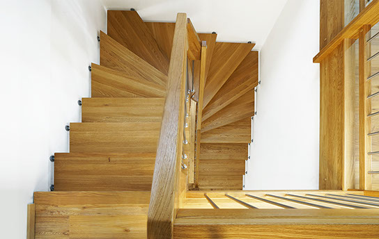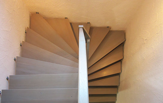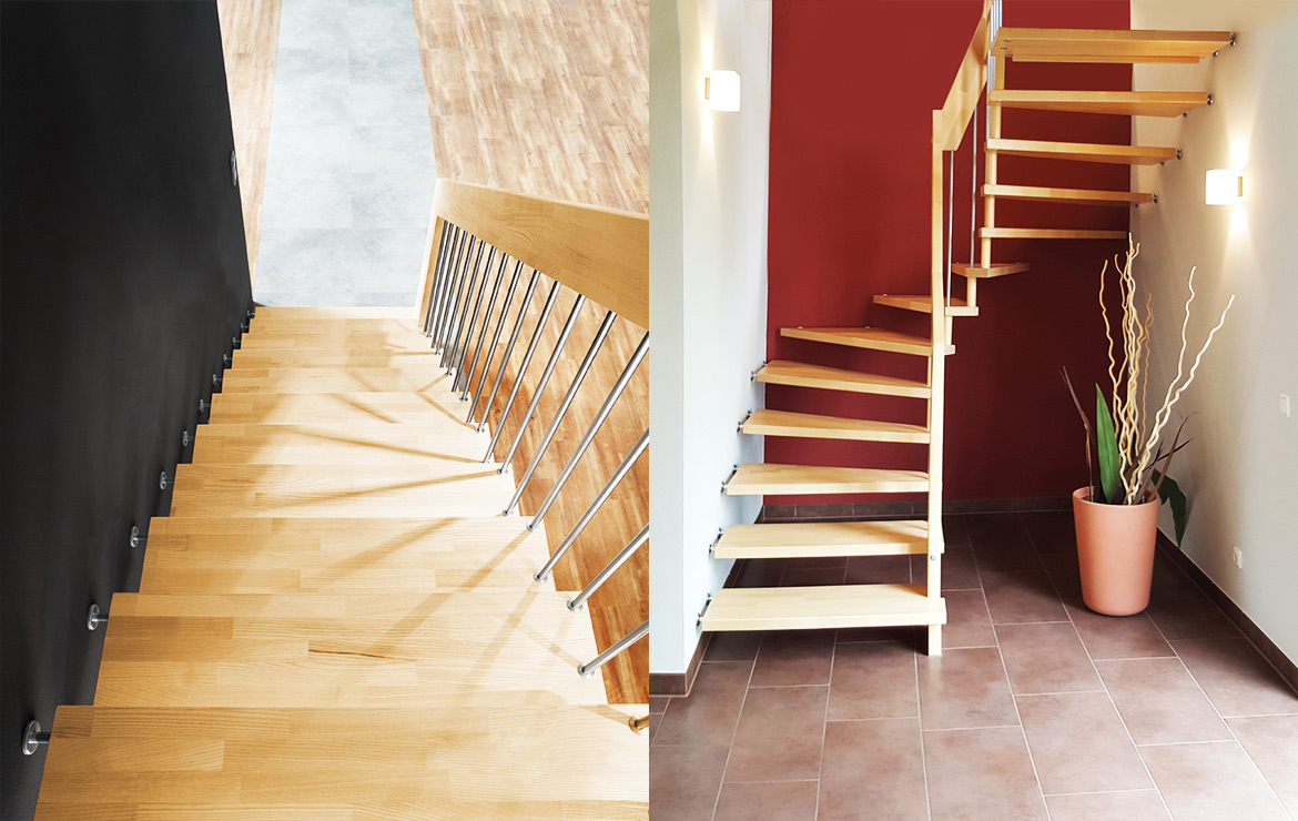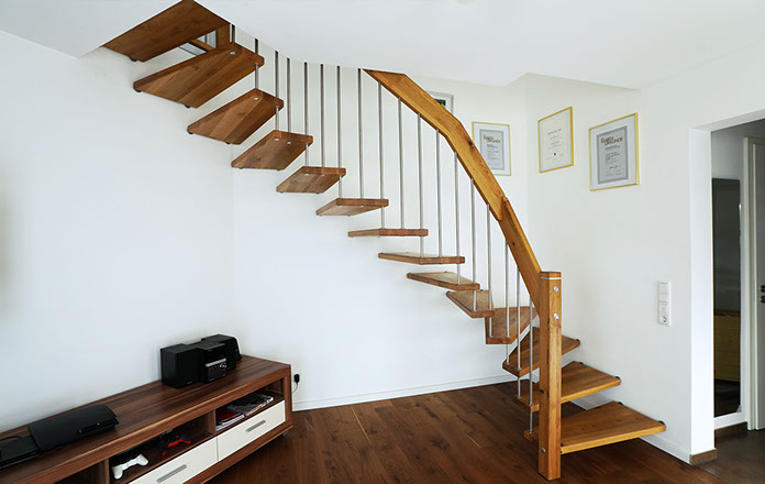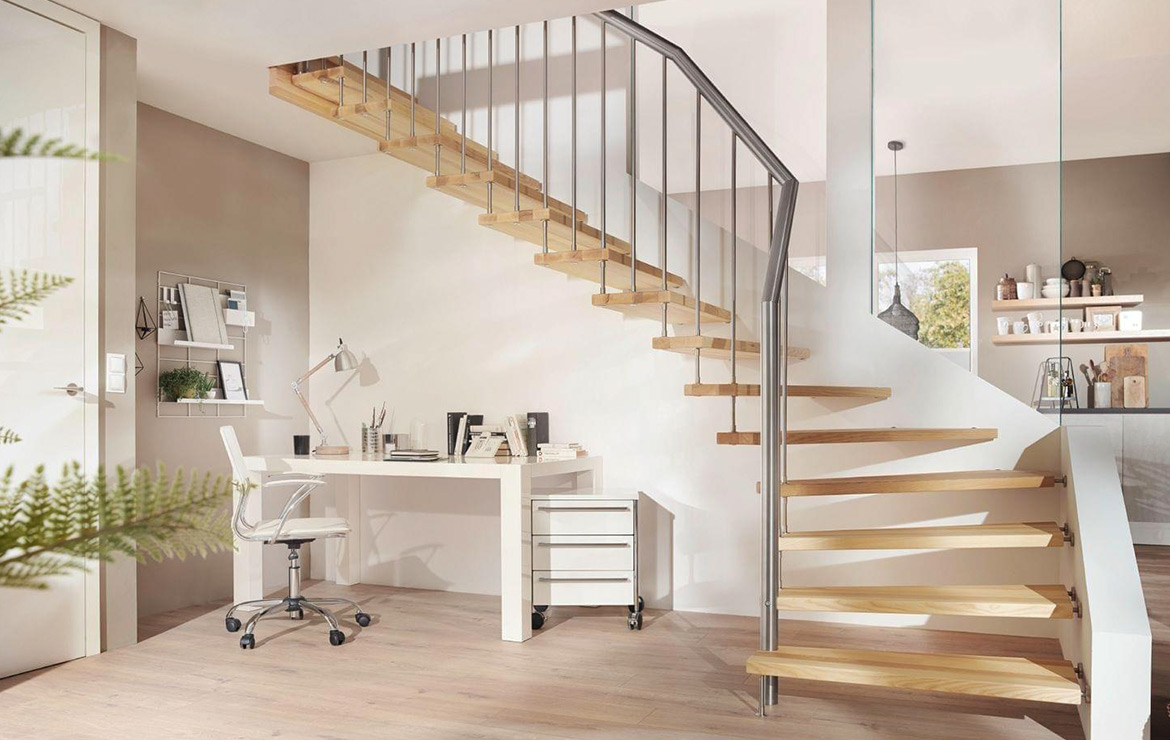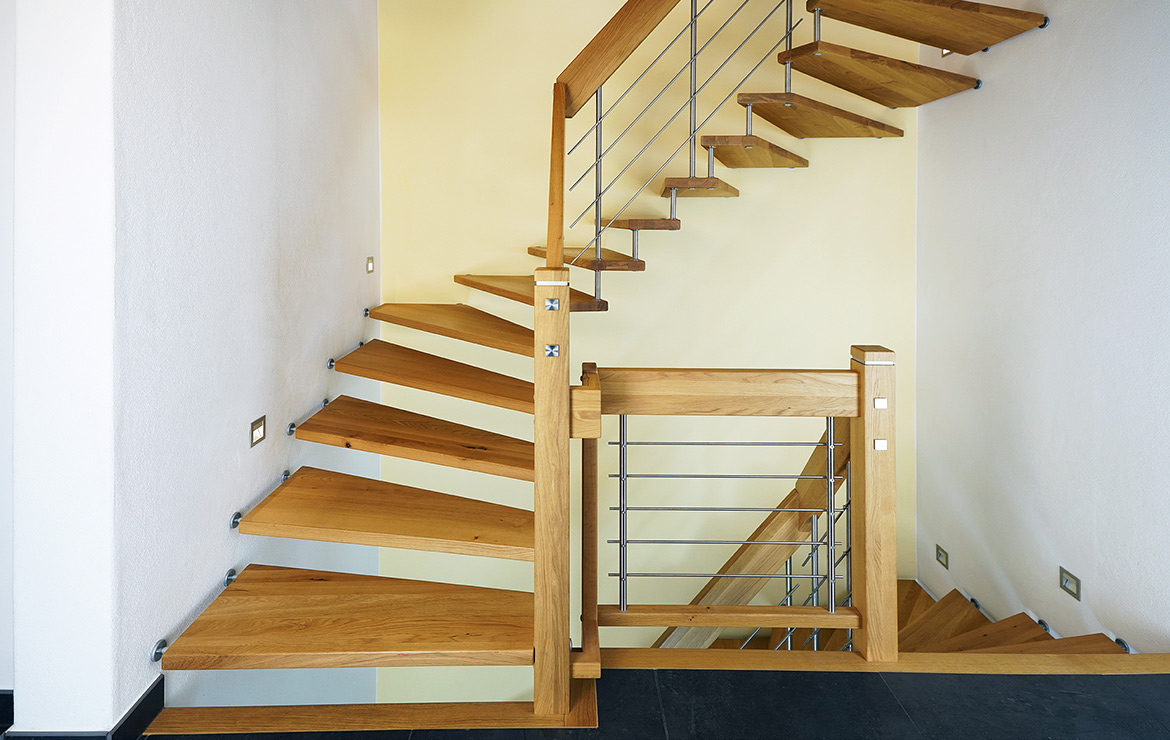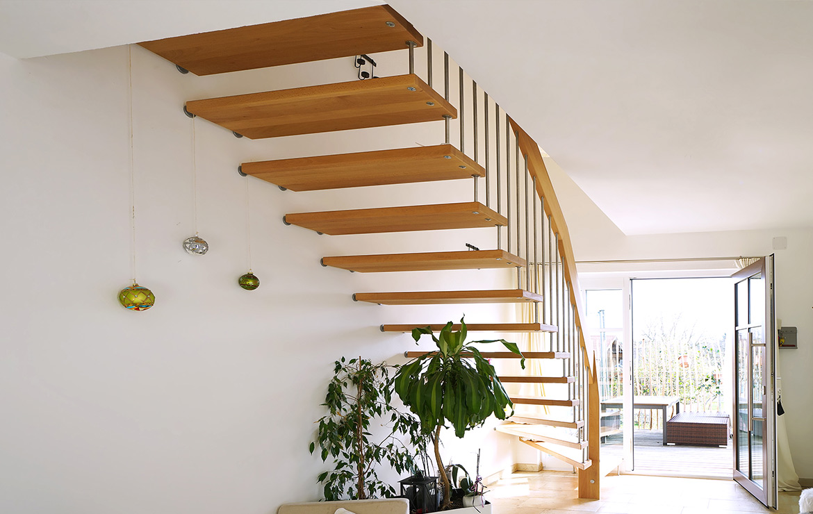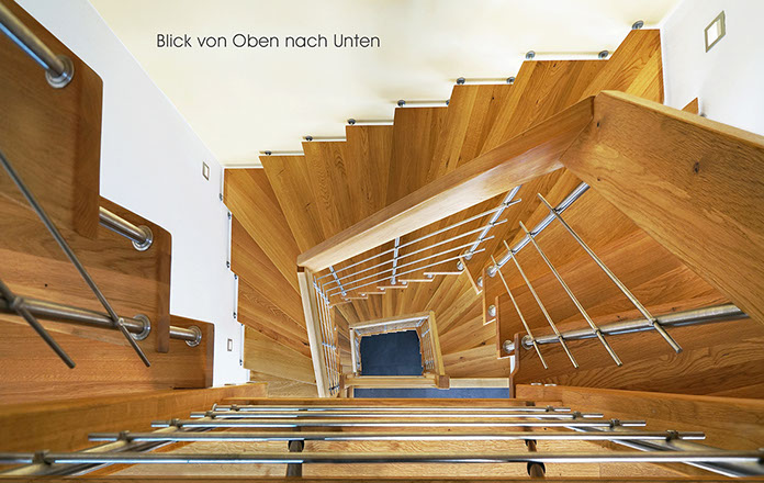 Das Geländer ist Teil der tragenden Konstruktion. Mit der Beschränkung auf das Wesentliche, nämlich Stufen und Geländer, wurde der Treppenbau revolutioniert. Quasi unsichtbar halten die in schalldämmenden Kautschuklagern gehaltenen Stahlbolzen auf der Wandseite die Treppe und das Geländer (Handlauf und Sprossen) die einzelnen Treppenstufen auf der offenen Seite. Eine optimale Verbindung aus Technik und Design, mit vielen Vorteilen.