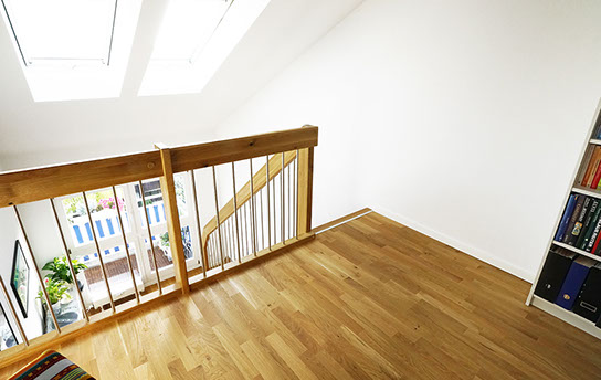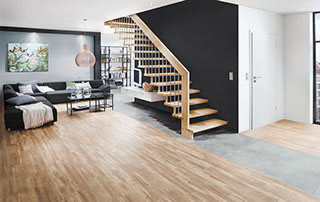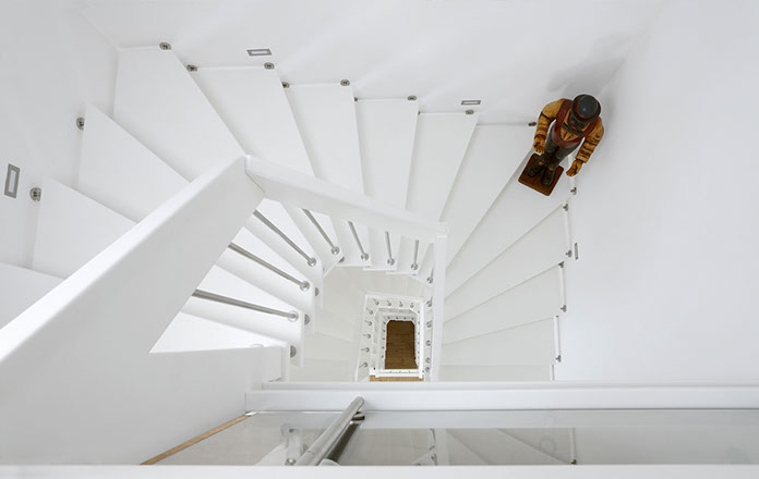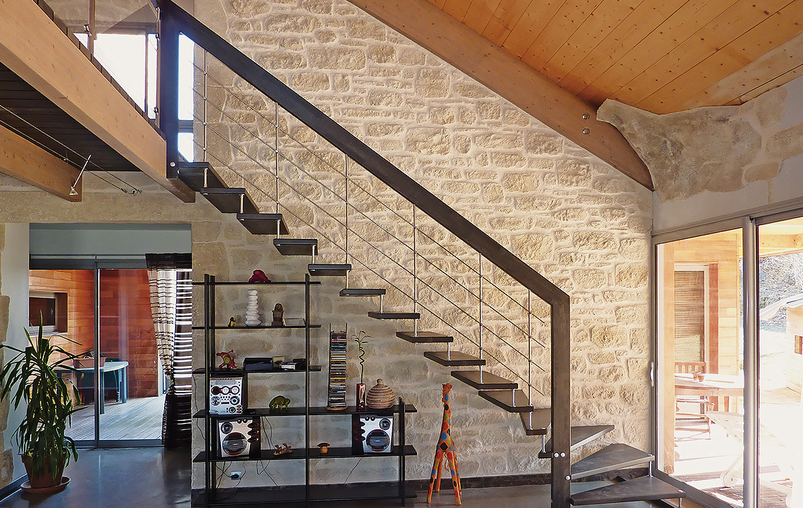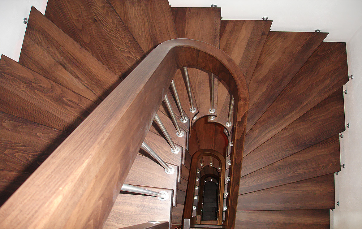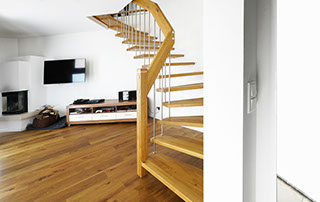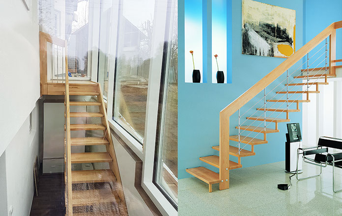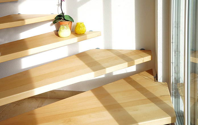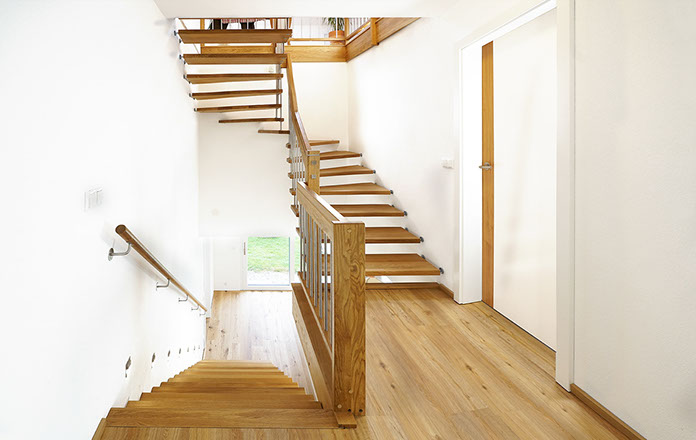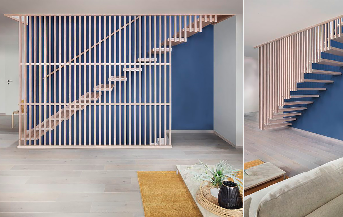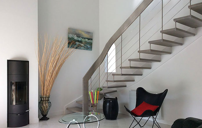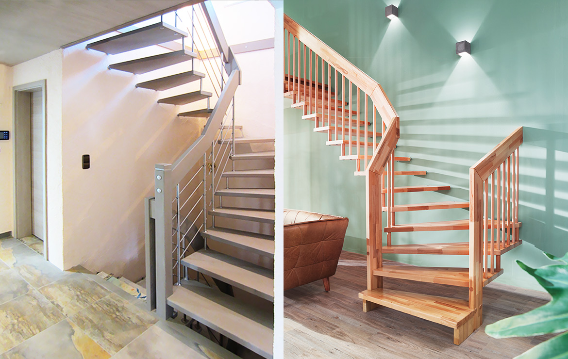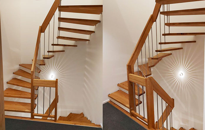 Das Geländer ist Teil der tragenden Konstruktion. Mit der Beschränkung auf das Wesentliche, nämlich Stufen und Geländer, wurde der Treppenbau revolutioniert. Quasi unsichtbar halten die in schalldämmenden Kautschuklagern gehaltenen Stahlbolzen auf der Wandseite die Treppe und das Geländer (Handlauf und Sprossen) die einzelnen Treppenstufen auf der offenen Seite. Eine optimale Verbindung aus Technik und Design, mit vielen Vorteilen.